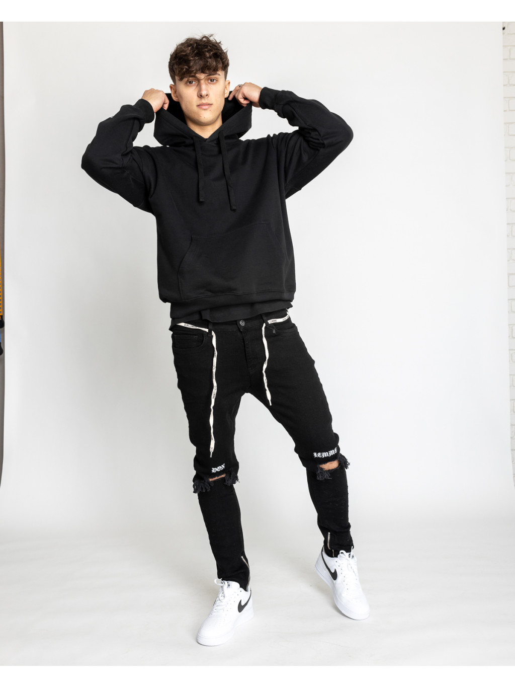 material extra flexibilslim fit - croiala mai largagenunchii sfâșiațilogo brodat deasupra genunchilorfermoare pentru gleznefixare cu nastureșliț cu fermoarpantaloni mai lungiconfort maxim5 buzunareȚiret cu sigla Don Lemme face parte din pachet și depinde de dvs. dacă o folosiți în loc de curea.
